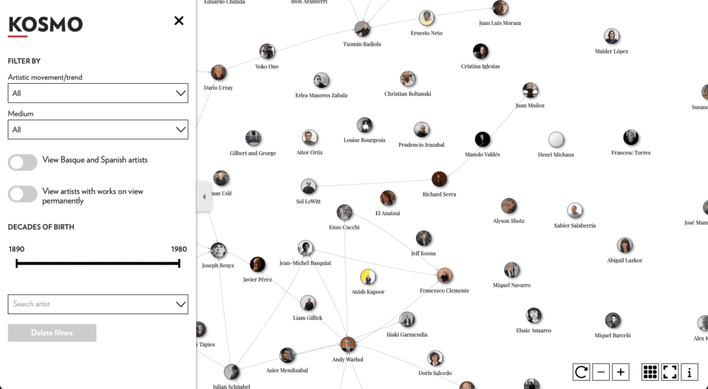 Kosmo is an interactive mediation tool that connects the artists in the Guggenheim Museum Bilbao’s collection in a dynamic, visual way. The resource offers through an intuitive interface a wide range of consultation possibilities, allowing you to create different exploration and discovery paths, and build a unique virtual experience.