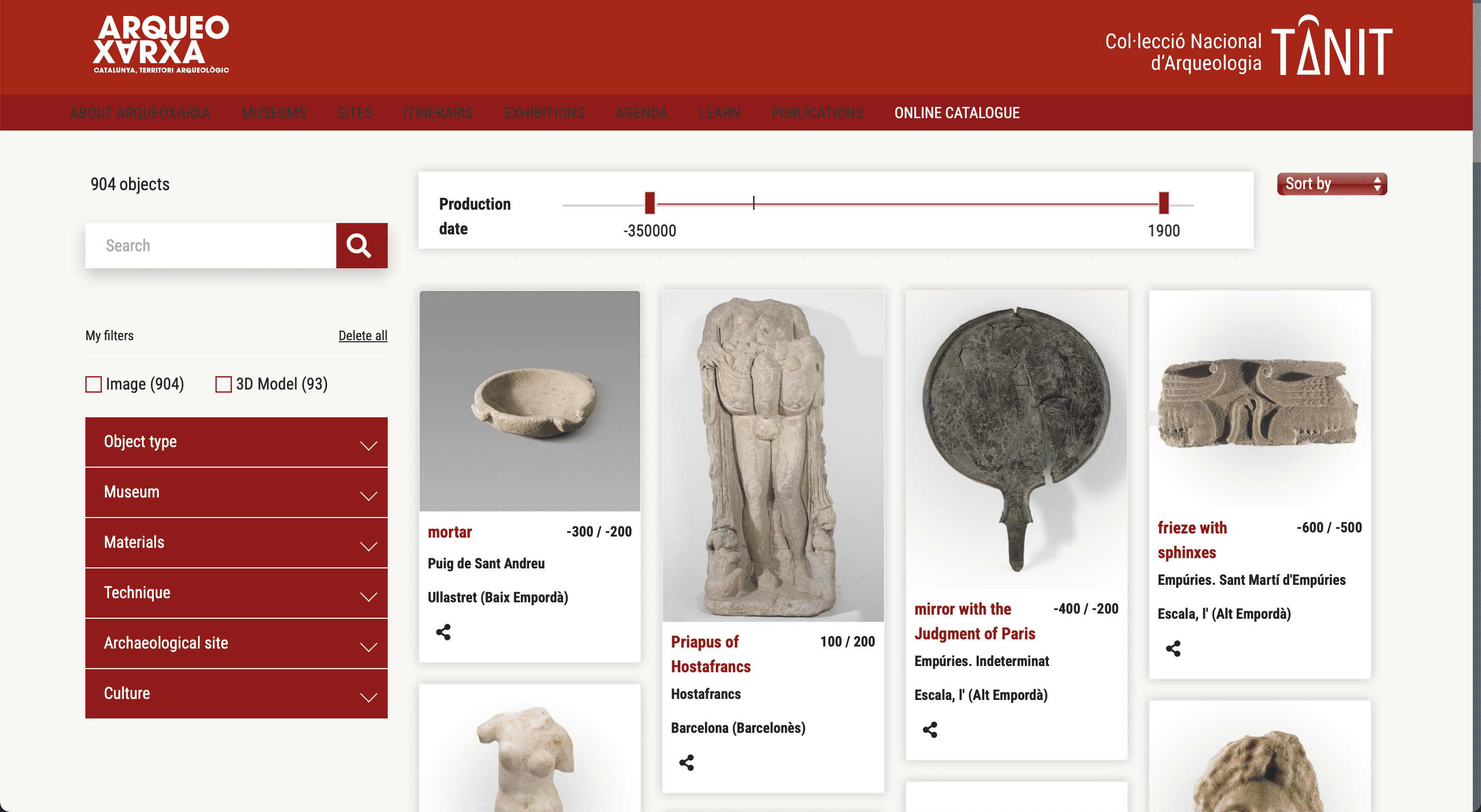 TANIT is a digital platform designed to disseminate the most relevant objects of the archaeological collections of Catalonia. It integrates the collections of eleven Catalan museums and offers a rich interactive browsing experience. The platform allows you to explore the history of Catalonia from prehistory to modern times through more than a thousand objects, and contains more than a hundred 3D models.